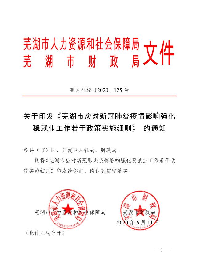 關于印發《蕪湖市應對新冠肺炎疫情影響強化 穩就業工作若干政策實施細則》的通知